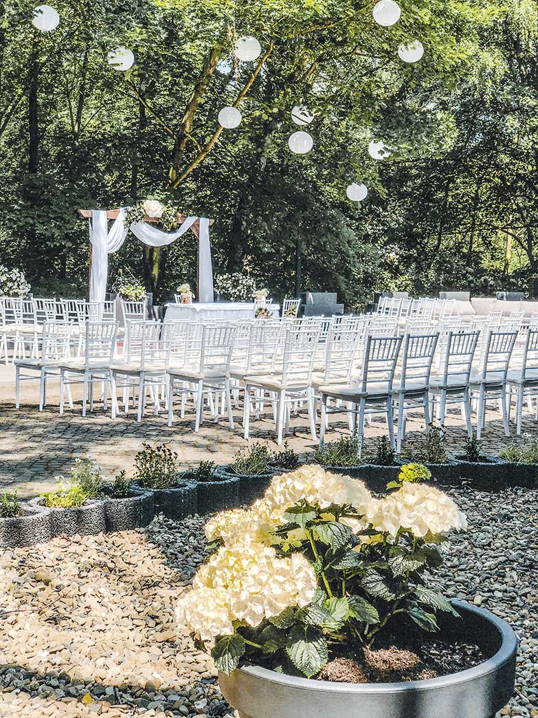 Ein weiterer Pluspunkt: die begrünte, ruhig gelegene Parkanlage auf dem Hof vor dem Haupteingang. Hier können im Sommer schöne, freie Trauungen arrangiert werden mit bis zu 180 Gästen.