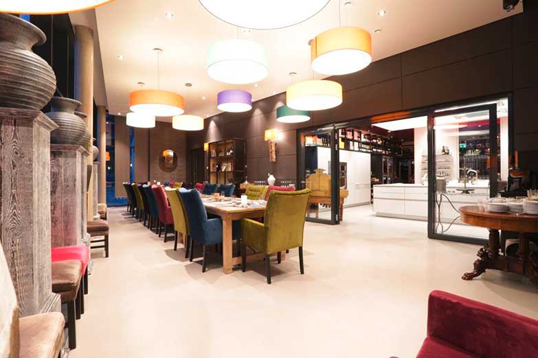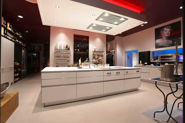 Seit 2016 fährt der sympathische Koch und Gastgeber mit holländischen Wurzeln in seiner kuechen.bar auf round about 300 schicken Quadratmetern ein für Braunschweig einmaliges Konzept aus Kochschule, Vinothek und Eventlocation. Und das in einem sehr eleganten Ambiente mit edlen Materialien kombiniert mit modernen, bunt-poppigen Farben.