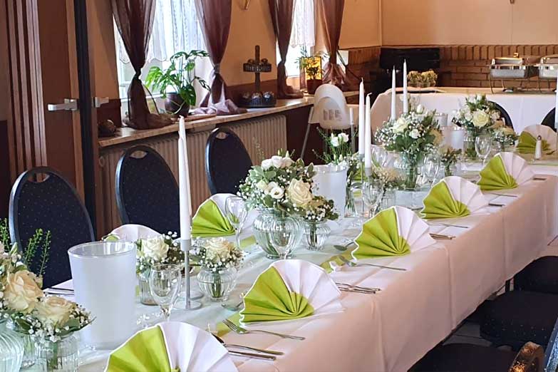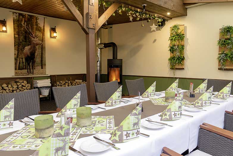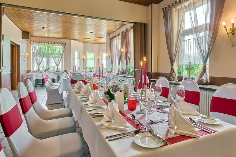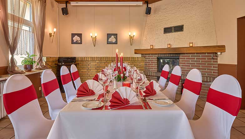 Für Feiern aller Art mit bis zu 45 Personen stehen in dem gastlichen Haus das Kaminzimmer, der Wintergarten und ein Clubzimmer zur Verfügung.