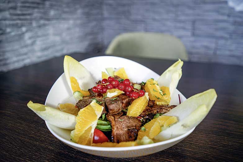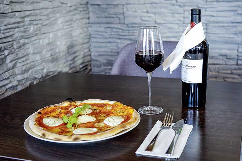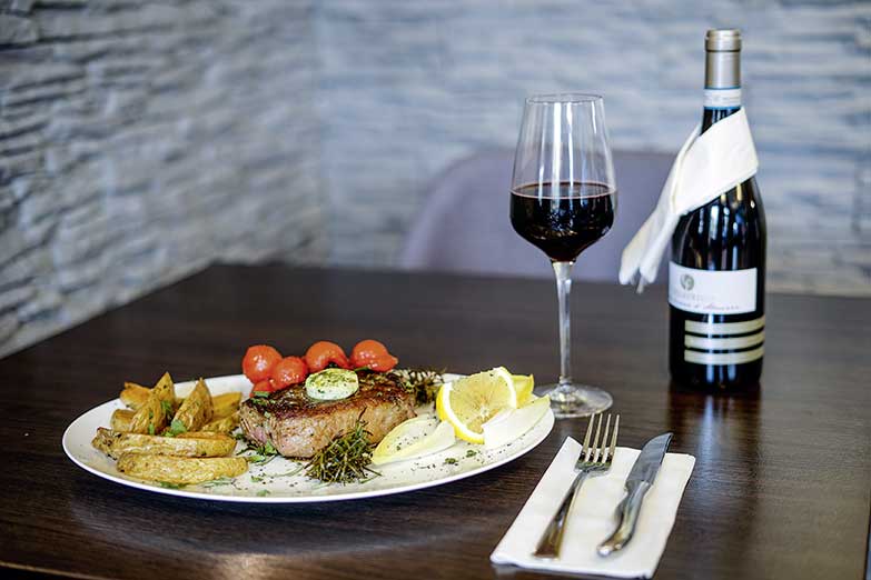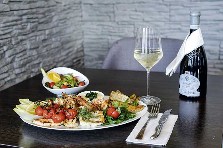Die Küche bietet das volle italienische Programm: Antipasti, Salate, Pizza, Pasta, Risotto, Fisch- und Fleischvariationen. Als Starter z.B. Carpaccio di Manzo, Vitello Tonnato Classico oder die hausgemachte Edel-Fischsuppe. Danach vielleicht Taglierini mit schwarzen Trüffeln im Pizzateig-Nest, Risotto Milanese mit Garnelen und Safran oder Tagliatelle mit Rinderfiletstreifen und Champignons. Zum genussvollem Hauptgang locken Kalbskotelett mit Salbeibutter und Rosmarin, gegrillte Lammkoteletts, Rinderfilet in Trüffelsauce oder eine Fischvariation mit mediterranen Kräutern. Dazu wird jeweils ein kleiner gemischter Salat, Ofenkartoffeln, Broccoli oder Spinat gereicht.