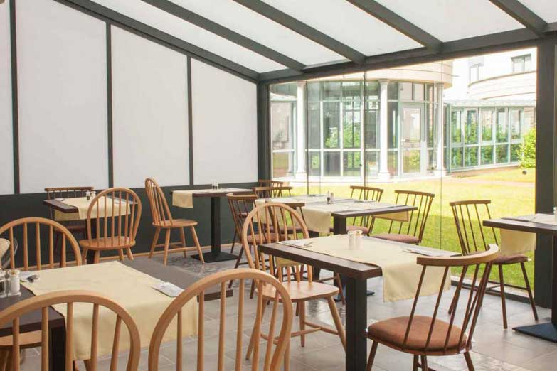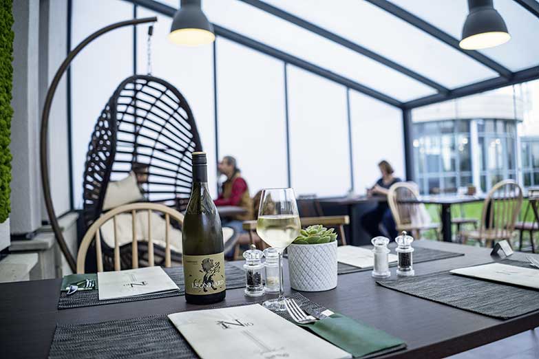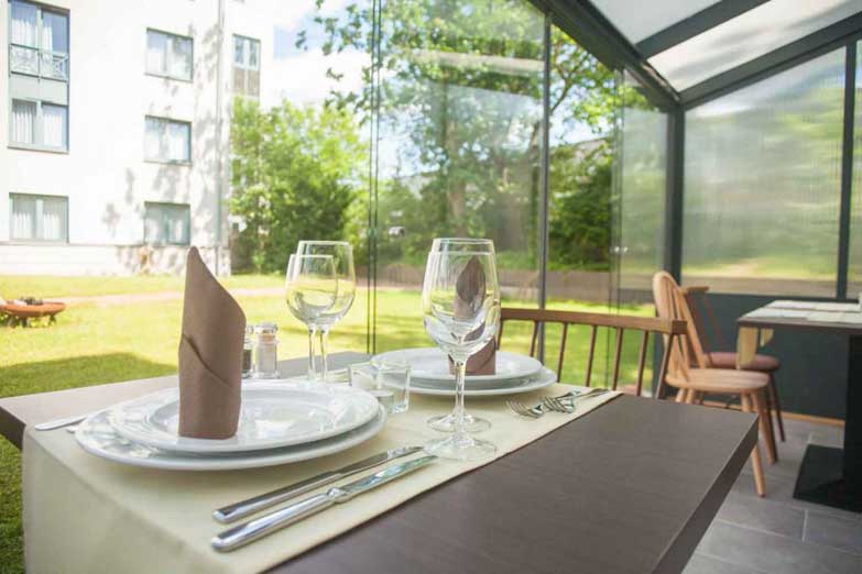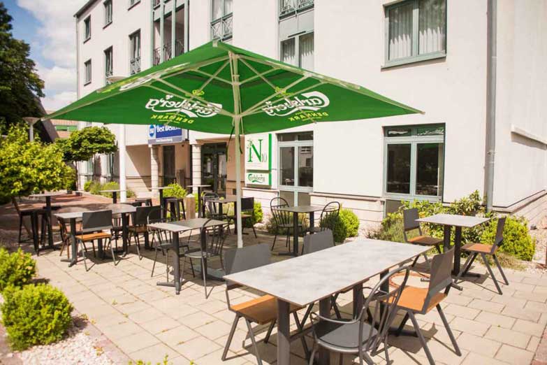 Bereichert wird die Location durch den großen Wintergarten mit Blick in den begrünten Innenhof der Hotelanlage. Und für mediterrane Genießerabende bietet sich der gen Westen ausgerichtete Biergarten an.