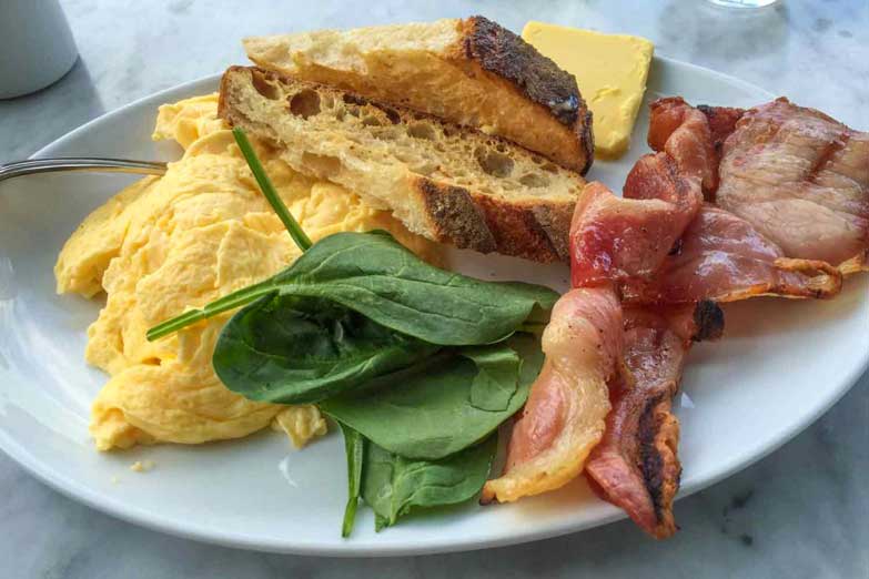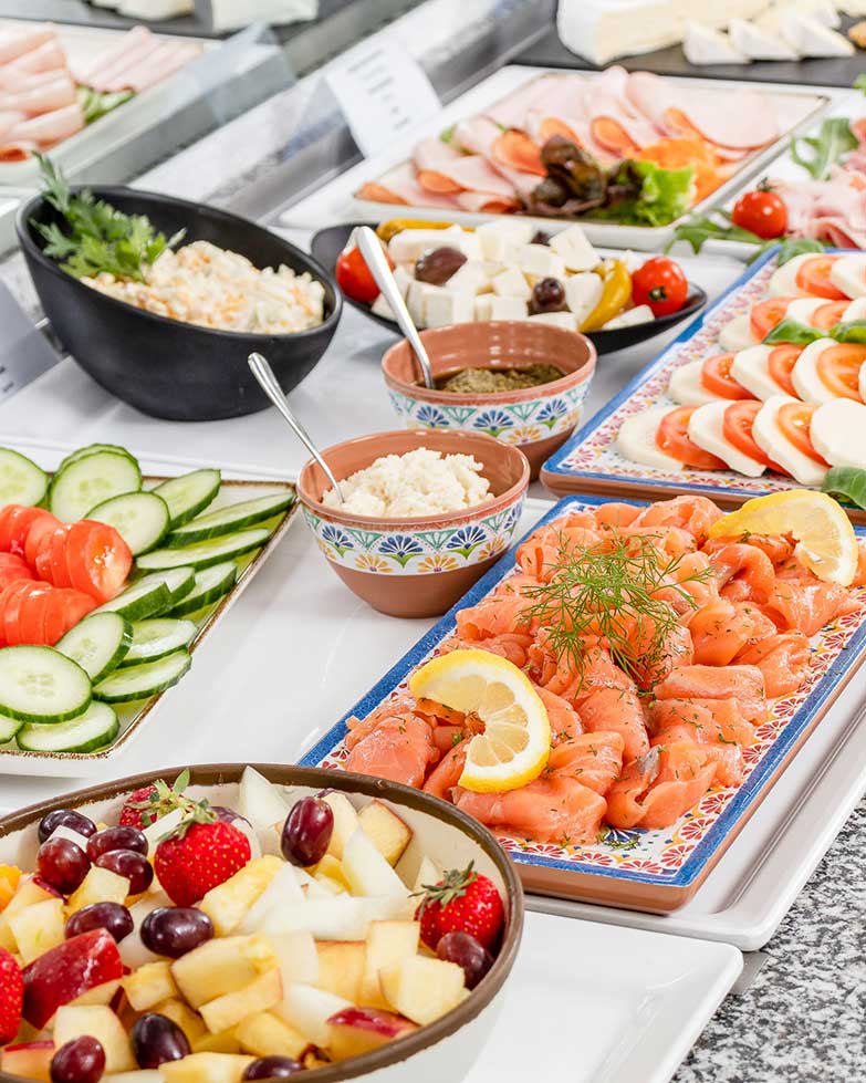 … mit frischem Brot und Brötchen, einer großen Auswahl an Käse, Wurst, Marmeladen, Honig … Außerdem Rührei und Bacon sowie Müsli, verschiedene Joghurtsorten, Obstauswahl, Kaffee, Tee und Orangen- und Multivitaminsaft.