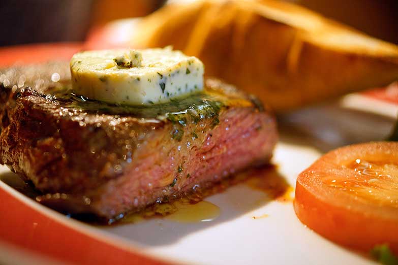 Durch die verglaste Küche kann man den Steakexpertos bei der Arbeit zuschauen und erhält schon mal einen Vorgeschmack auf den baldigen Fleischgenuss. Im El Gaucho werden Qualitätssteaks aus Argentinien klassisch zubereitet … und zwar auf dem Holzkohlegrill, damit der Geschmack des mageren, saftigen Fleisches richtig zur Geltung kommt. Bevor man sich darüber hermacht, bietet sich vielleicht noch ein gegrillter Maiskolben mit zerlassener Butter oder eine hausgemachte Gulaschsuppe an. Die geschmackvoll gewürzten Steaks gibt es vom Rind, Schwein, Geflügel oder Lamm, z.B. zartes Lammfilet (220g) mit Kartoffelscheiben, dazu Special-Creme und Prinzessbohnen oder Mixta Carne „EL Gaucho” (ca. 350g) – ein üppiger Grillteller mit Rind-, Lamm-, Puten- und Schweinefleisch, dazu Speckstreifen und Maiskolben. Ein fleischgewordener Traum: das super saftige Grand Beef „Don Carlos“ – satte 450g feinstes Entrecôte mit typischem Fettauge.