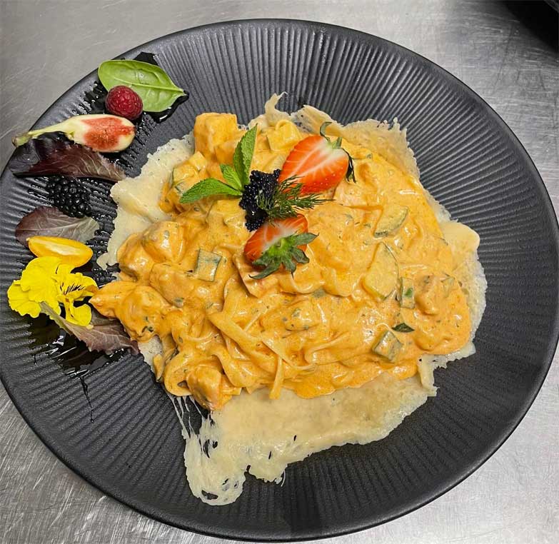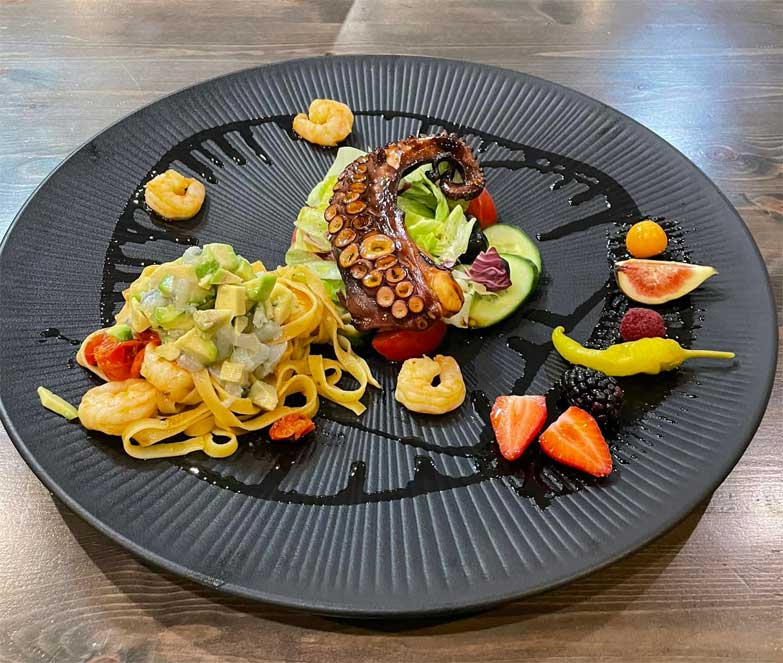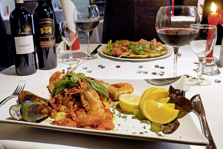 Und auch die Küche hat einiges zu bieten: Antipasti … von Carpaccio, Vitello Tonnato bis zur Mediterraneo Platte mit gefüllten Sardinen, gratinierten Muscheln, Oktopus und Räucherlachs, außerdem Fleisch- und Fischspezialitäten, wie das Lammfilet in Barolosauce, Rinderfilet al Gorgonzola, Doradenfilet in Zucchinikruste oder die gemischte Fisch-Grillplatte. Tagesgerichte, saisonale Kreationen, neapolitanische Pizzen aus dem holzbefeuerten Ofen und Pasta-Variationen, Qualitätsweine von Amarone bis Barolo oder regionales Bier aus Fallersleben runden das Angebot ab.