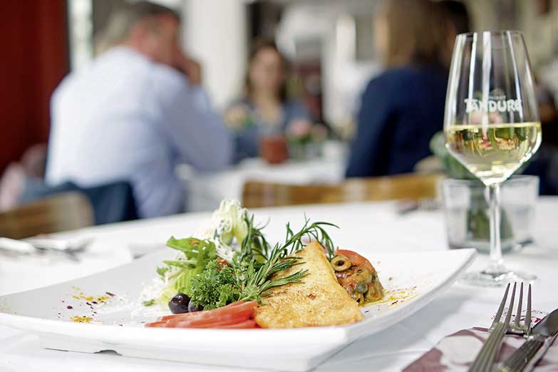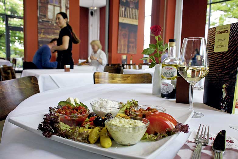 Bei schönem Wetter lockt die große Terrasse vom Tandure mit 150 Plätzen und eigenem Kräutergarten ins Freie. Hier schmeckt die gegrillte Dorade oder eins der wechselnden, frischen Fischgerichte gleich noch viel besser.