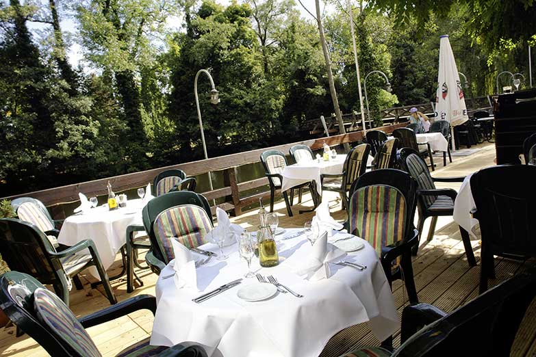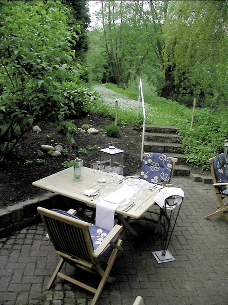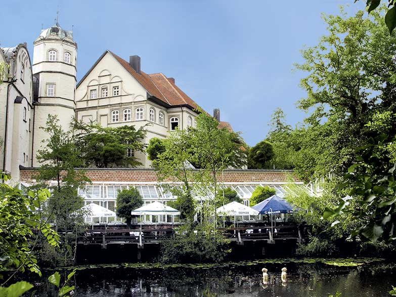 Wunderschöne Terrasse mit Platz für bis zu 80 Personen und direktem Blick auf den idyllischen Schlossgraben.