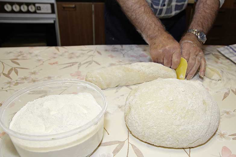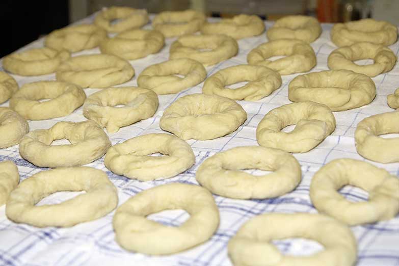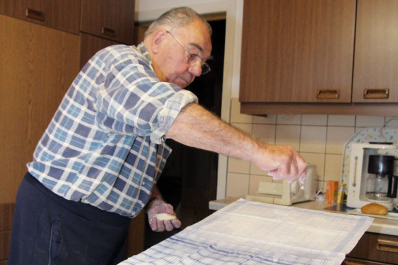 2) Auf einem Tisch Geschirrtücher ausbreiten und mit Mehl bestäuben. Da kommen die Teigkringel später drauf. Nun wird es ernst: Den Teig erst in ordentliche dicke Würste unterteilen und dann mit einem Teigschaber kleine Teigportionen abtrennen. Diese dann in Schlangen rollen und zu Kringeln formen. Ich habe es ehrlich gesagt beim ersten bis 30. Mal auch nicht vernünftig hinbekommen. Opa ist da natürlich Superprofi. Die Prilleken auf dem Geschirrtuch weitere 20 bis 30 Minuten gehen lassen.
