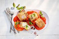 Feta in Chia-Sesam-Knusperhülle auf Tomaten