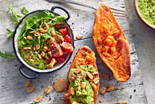 Gebackene Süßkartoffel mit Erbsen-Hummus