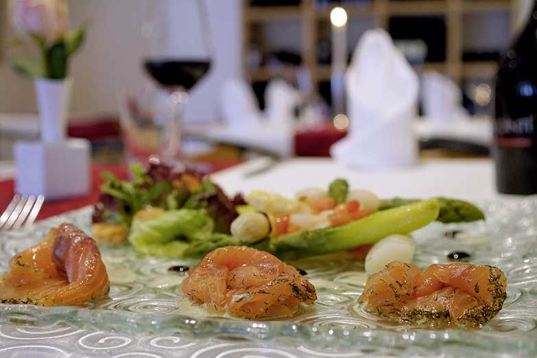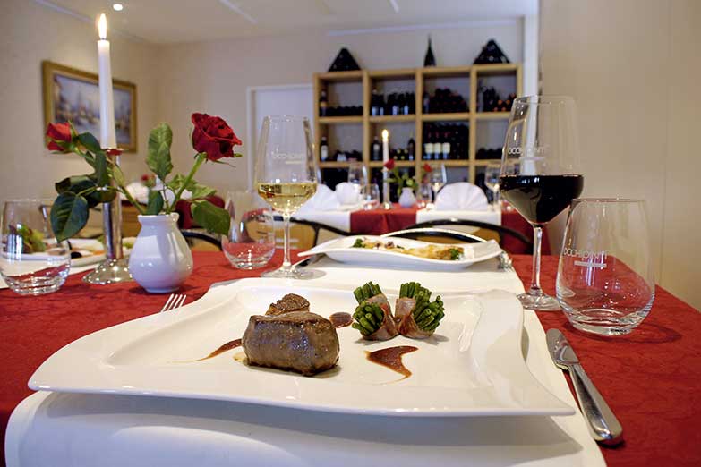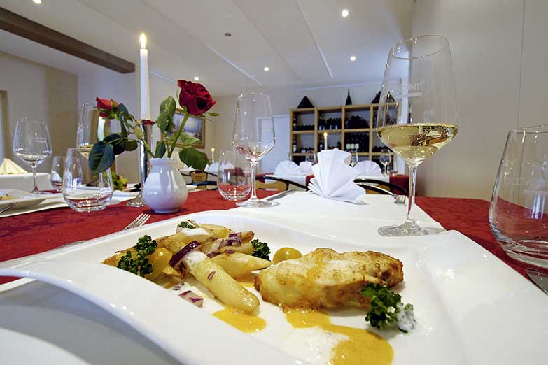 Natürlich steht die Heimat Italien im Focus der Küche, z.B. Rucolasalat mit gebratenen Austernpilzen, Shizokresse und Balsamico, Carpaccio vom Rinderfilet, Lachstartar mit Crostini, hausgemachte Tagliatelle mit frischen Trüffeln, Doradenfilet in Folie gegart mit Kräuterseitlingen und Kartoffeln oder Lammhaxe mit Bohnenbündchen und Gratinkartoffeln. Die Karte wird immer wieder erneuert. Besondere Tagesempfehlungen und Aktionen wie Fisch-Menues, Osterbrunch, Mai-Ball, Spargel- oder Schnitzelbuffets sorgen immer wieder für neue Anreize. Die Termine findet man auf der Webseite.